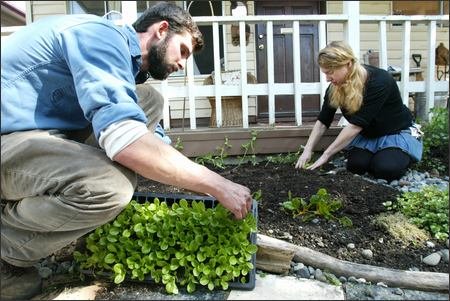 Haas, a 36-year-old entrepreneur and consultant, is not alone in her produce ponderings. There's a growing interest in turning lawns and landscapes into pesticide-free, food-yielding gardens. More urban residents are seeing the potential for growing their own fruit and vegetables, but many don't know how to dig in. "We've seen that growth (in gardening interest) and added so many more programs recently," said Kathy Dang, a teacher at Seattle Tilth, an organic gardening non-profit group founded in 1978. In 2001, Seattle Tilth began teaching a comprehensive organic gardening course once a year. Demand has increased that to three times a year since 2006. A February class on growing vegetables from seeds filled up and a second one was added for March. It sold out, too. Seattle's P-patch program has about 70 community garden patches citywide. But even with enough plots for 6,000 gardeners to plant, weed and harvest, there are more than 700 people on the waiting list. Some P-patches have a three-year wait. Earlier this year, at least two Seattle businesses were launched that will help novice gardeners navigate the garden rows of their own backyards. Colin McCrate, owner of Seattle Urban Farm Co., set up a booth at the Ballard Farmers Market selling small vegetable plants called starts. People would come look at the starts and say to him, "I'd like to be doing this, but I have no idea what I'm doing, and I don't know where to start," he said. Haas was one of those people. Now McCrate is advising her on what, when and where to plant the vegetables and herbs she wants for an urban garden to satisfy her cooking needs. His company offers a range of services -- even building and planting your garden beds and maintaining your plants. "It'll save me a ton of money," Haas said. "Not having to buy herbs alone will save me money." Organic food connectionThe reasons for urbanites' growing interest in edible gardens are as numerous as the varieties of heirloom tomatoes. In one regard, it follows a natural progression. City dwellers became devout consumers of organic fruit and vegetables, getting hooked on such grocers as PCC and Whole Foods. For some, their devotion soured when the market shifted toward mass-produced organic foods. Then they became loyal farmers-market shoppers. They appreciated the energy that's saved and global warming that's prevented when an apple is shipped from Wenatchee instead of New Zealand. They got to know the sellers. It helped begin the reconnection with where food comes from and shopping for items that are in season. Outbreaks of bacterial contamination in spinach and cantaloupe made people question their food sources. Now the city slickers are grabbing a trowel and seed packets and growing zucchini along their front walks and parking strips. Porches are home to peppers in pots. "We're talking about food that's traveling on average about 100 feet" from garden to table, said Craig Cogger, a soil scientist with Washington State University's Puyallup branch. "It's fresh, and you know how it was grown, and it's really a way to participate in the food system. "You go back to the turn of the 20th century, we were still a nation of farmers at that point. There was a connection to the land," he said. "We lost some of our humility as people, and we've lost our connection to the humus." During World Wars I and II, vegetable gardening was even an act of patriotism and a means of boosting morale. U.S. "victory gardens" provided about 40 percent of the produce consumed in the nation during World War II. With citizens growing their own produce, more and cheaper commercially produced food was available to send to the troops. That left more money for fighting the war. In the postwar period, a shift began toward landscaping and lawns -- particularly emerald green and weed-free lawns. In many places, the vegetables were gone. The flow of gardening wisdom that had passed from one generation to the next dried up. A new look in landscapingThe love of flawless lawns seems to be withering in the Northwest as people become more concerned about pesticides and conserving water -- and more open to the idea of gardens. Lettuce beds and pea vines are cropping up where grass once ruled supreme. Fruit trees are interspersed with the rhododendrons and Japanese maples. Since 2005, Fritz Haeg, a Los Angeles-based artist and architect, has been creating "edible estates" -- tearing out traditional yards and converting them to food gardens. "It just started off as this one-off little art project in Salina, Kansas," he said. "It touched some sort of nerve." Now he's setting up a demonstration garden in nine growing regions nationwide. "I'm looking for areas where they'll really cause a stir," Haeg said. He creates fruit- and vegetable-bearing landscapes that are "aggressively beautiful." He's challenging ideas that food-producing plants are ugly. Urban farming that was once an act of patriotism is in some cases now an act of rebellion. Gardeners are asserting their independence from the commercial food industry. They're breaking the bonds of landscape conventions. Haas, the beginning gardener in the Central District, hopes urban farming becomes a peaceful, community-building revolution. She'd love to see gardening taught to schoolchildren. "This is really about changing people's perceptions," she said. "Everyone wants to eat the best, freshest food, and people don't think they can create a cornucopia for themselves. "This is a way to bring nature into people's lives." DIG INTO URBAN FARMING